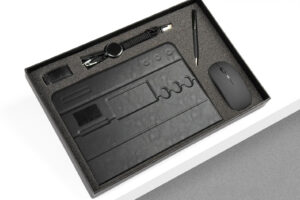Elegant Business sets that include smart notebooks, metal customized pens , wireless chargers , metal keychains , charging cables , leather wallets and etc.